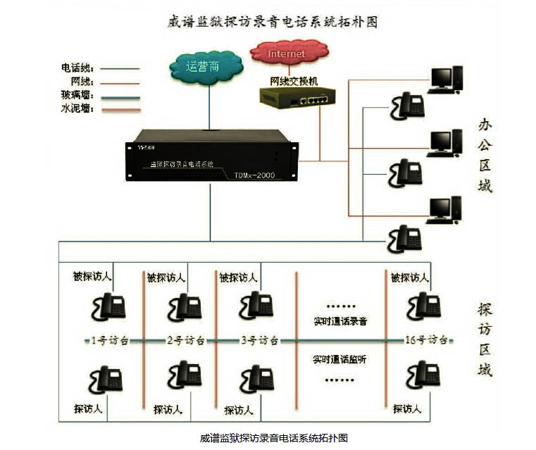 為了適應(yīng)現(xiàn)代化監(jiān)獄的管理需要,順應(yīng)電子時(shí)代的發(fā)展,廣州市華譜電子科技有限公司推出了:威譜監(jiān)獄探訪錄音電話系統(tǒng)。威譜監(jiān)控探訪錄音電話系統(tǒng)集電話語音系統(tǒng)、監(jiān)獄探訪錄音系統(tǒng)為一體,可促使監(jiān)獄的探視管理更加完善地走向現(xiàn)代化、制度化與規(guī)范化的管理。如:方便親人、朋友對犯人的探視、溝通,調(diào)節(jié)犯人的歪曲心理狀態(tài)和避免同類事件的重復(fù)發(fā)生,以達(dá)到減少犯罪的機(jī)率和一些不必要的特殊事件會再次發(fā)生。