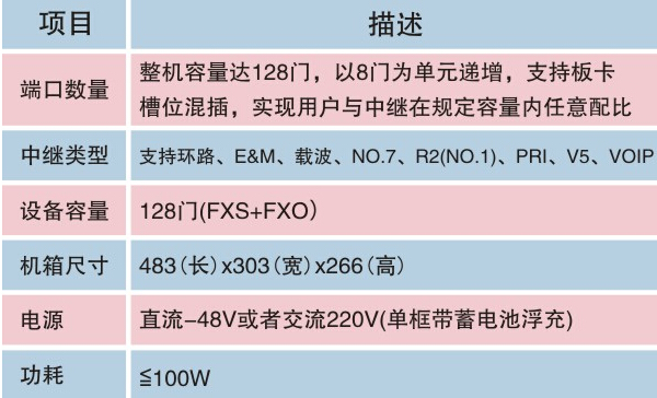 系統(tǒng)可提供2個(gè)E1接口、64個(gè)環(huán)路中繼,可提供128路語音端口