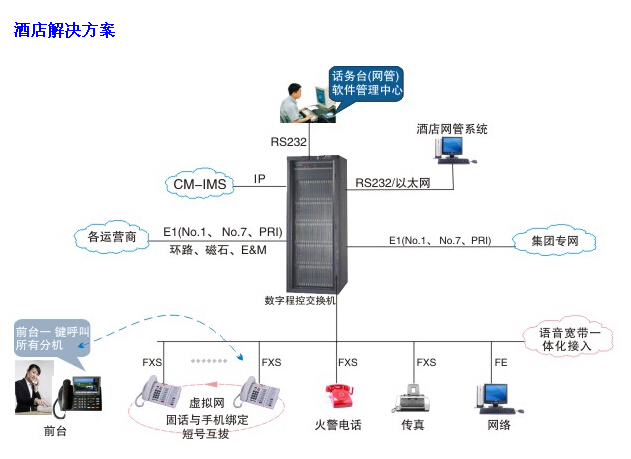 HJ-E800B數(shù)字程控交換機是E800系列產(chǎn)品中容量最大的新一代產(chǎn)品,融合了電路、IP、光纖接入等技術(shù)開發(fā)生產(chǎn)的新一代數(shù)字程控交換機,支持環(huán)路、E&M、載波等模擬中繼和No.7、R2(NO.1)、PRI、V5信令等協(xié)議的數(shù)字中繼;支持光接口、E1接口方式的遠(yuǎn)端模塊延伸;支持基于H.323協(xié)議、SIP協(xié)議的VOIP中繼,是用戶改善通訊條件、提高工作效率、控制話費支出、實行辦公智能化的理想設(shè)備具有使用方便靈活,具備可靠性高,容量大等新特點,系統(tǒng)廣泛應(yīng)用于商務(wù)辦公、工廠、政府、醫(yī)院、酒店、學(xué)校等企事業(yè)單位。