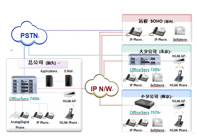 OfficeServ 7200 All In One解決方案 OfficeServ 7200 不僅是聲音和數(shù)據(jù)的融合,也是有線和無線通信的融合。融合的有線和無線通信為您提供完整的傳統(tǒng)通信平臺(tái)功能,加上方便、高效、不間斷的無線接入設(shè)備。此外,融合的語音和數(shù)據(jù)在一個(gè)綜合平臺(tái)為您的企業(yè)通信要求提供了高性價(jià)比的解決方案。誠然,這一新的設(shè)備吸收世界上最好的——更高效、更靈活、更完整的企業(yè)通信。 單機(jī)柜共5個(gè)自由槽位,最大40模擬中繼,60數(shù)字中繼,80數(shù)字/模擬分機(jī) 雙機(jī)柜共10個(gè)自由槽位,最大64模擬中繼,60數(shù)字中繼,128數(shù)字/模擬分機(jī) 企業(yè)應(yīng)用示意圖(網(wǎng)絡(luò)解決方案)